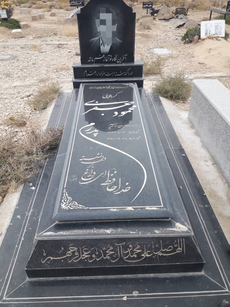 سنگ مزار مشکی برزیلی ابعاد 180 در 60 ضخامت 3 سانتی متر چاپ عکس لیزری و حکاکی نوشته بر روی آن